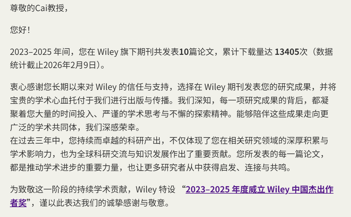 蔡志雄教授在2023-2025年间,在Wiley旗下期刊共发表10篇论文,其中包括Angew. Chem. Int. Ed. 2篇, Adv. Funct. Mater. 1篇,Chem. Eur. J. 2篇, Adv. Opt. Mater. 1篇等,累计下载量达13405次(数据统计截止2026年2月9日)。为致敬其这一阶段的持续学术贡献,Wiley中国特授予蔡志雄教授“2023-2025年度威立Wiley中国杰出作者奖”荣誉称号。