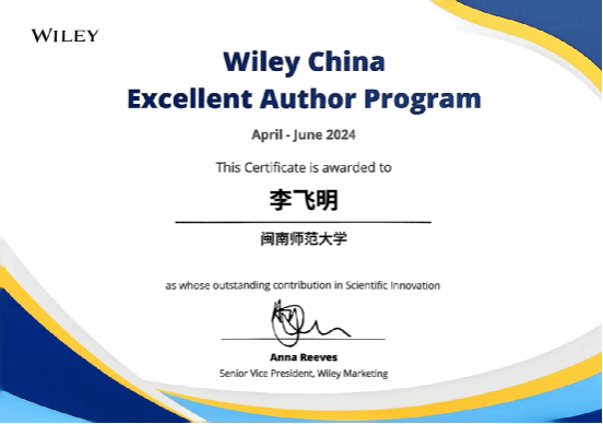 李飞明副教授发表于Wiley集团出版期刊Small Structures的论文“Photoinduced Dehalogenation based Direct In-situ Photolithography of CsPbBr3 Quantum Dots Micropatterns for Encryption and Anti-counterfeiting with High Capacity” ,一经发表便备受关注,该文在该期刊中国作者2024年第二季度发表文章三月内下载量中位列前茅。为此,Wiley中国授予李飞明副教授2024年第二季度“威立Wiley中国高贡献作者奖”荣誉称号。