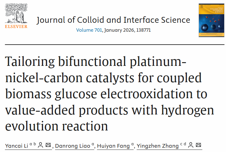 随着全球对可再生能源和绿色化工需求的日益增长,如何在能源转化过程中实现“化学品增值”与“清洁能源产出”的协同,是当前能源化学领域的重大挑战。生物质衍生物葡萄糖的电催化氧化(GOR),能够将其转化为高附加值化学品,同时耦合析氢反应,是一条极具吸引力的双向增值路径。然而,开发兼具高活性、高选择性和稳定性的双功能催化剂仍是当前面临的巨大挑战。近日,闽南师范大学化学化工与环境学院李艳彩教授联合清源创新实验室张颖贞博士后,在《Journal of Colloid and Interface Science》(中科院一区Top期刊)发表最新研究成果,报道了一种具有优异电催化性能的双功能Pt/Ni-NC催化剂,该催化剂在葡萄糖电氧化过程中表现出优异的催化活性和稳定性,同时在阴极侧有效促进析氢反应,实现了电能驱动下的生物质高值化与能源共生产。这一策略打破了传统电解水仅产氢的单一模式,将“废弃生物质”转化为“绿色能源+高附加值化学品”的新途径,为未来可持续能源体系提供了新范式。该催化剂不仅能够高效催化生物质葡萄糖电氧化反应,实现高附加值化学品(乳酸和甲酸)的制备,还能同步促进产氢反应(HER),实现绿色制氢。这项工作为耦合生物质转化与清洁能源生产提供了新的解决方案,展现了“双碳时代”背景下的能源创新方向。通过精确调控Pt与Ni的组分及碳载体结构,制备出高分散的Pt-Ni纳米催化剂。