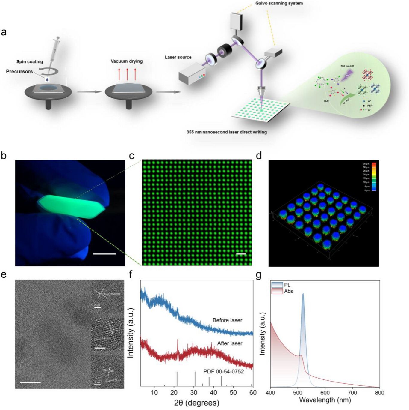 近日,我重点实验室MOOM团队李飞明课题组在激光直写制备铅卤钙钛矿纳米晶(lead halides perovskite nanocrystals,LH PNCs)图案化微阵列研究方面取得重要进展,相关研究成果以“Laser-Induced Dehalogenation for Direct Writing Stable, Thermally Robust Patterned Arrays of Lead Halide Perovskite Nanocrystals”为题发表在国际光子学领域权威学术期刊《Laser & Photonics Reviews》上(中科院一区,IF = 10.0)。